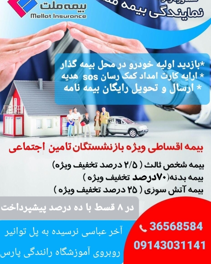 بیمه ثالث و بدنه خودروی بازنشستگان محترم و خانواده هایشان بصورت اقساط کسر از حقوق *** بازنشستگان محترم کشوری یازده قسط بدون پیشپرداخت *** بازنشستگان محترم تامین اجتماعی در هشت قسط با ده درصد پیشپرداخت ***بیمه آتش‌سوزی زلزله منزل مسکونی نیز بصورت اقساطی صادر میگردد ***حتی نیاز به مراجعه حضوری هم نیست میتوانید با ارسال تصویر مدارک بصورت آنلاین از خدمات بیمه بهره مند گردید ادرس: خیابان عباسی.پل توانیر بطرف فهمیده.روبروی ایستگاه نانماشینی.دفتر بیمه ملت.نمایندگی قنبرزاده