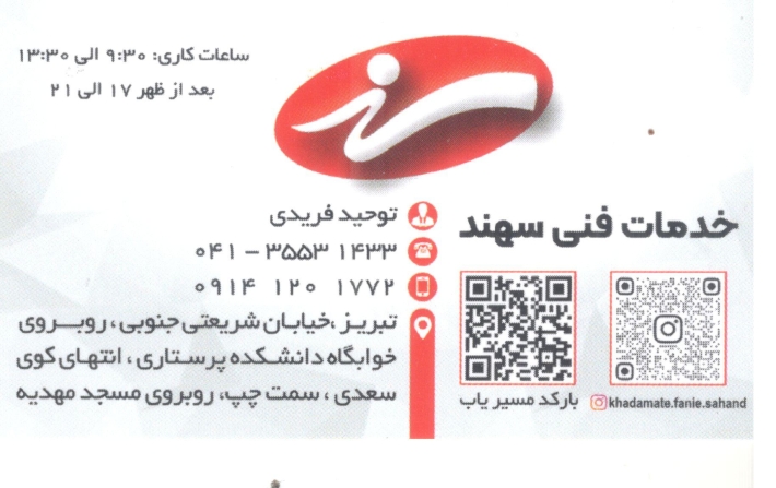تبریز- خ شریعتی جنوبی– روبروی خوابگاه دانشکده پرستاری– انتهای کوی سعدی –سمت چپ - روبروی مسجد مهدیه - خدمات فنی سهند/ تلفن: 35531433-041 همراه: 09141201772