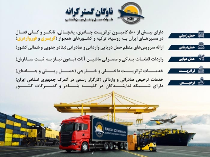 - دارای بیش از 500 کامیون ترانزیت چادری، یخچالی، تانکر و کفی فعال، در مسیرهای ایران به روسیه، ترکیه و کشورهای همجوار (کریری و فورواردری)