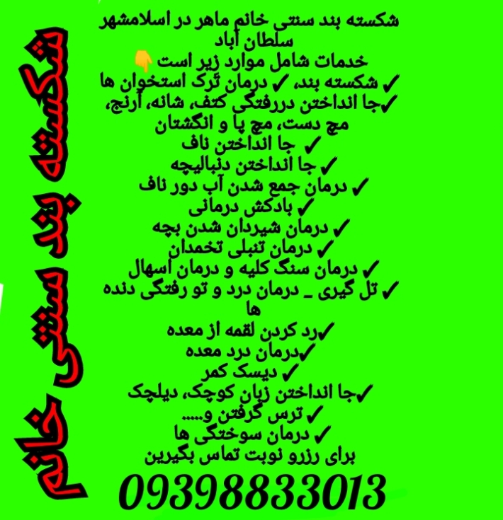 تخصص شکسته بند سنتی در اسلامشهر، ریشه در سال ها تجربه و دانش بومی دارد. این متخصصان با بهره گیری از روش های اصیل و провереده، به درمان انواع شکستگی ها، دررفتگی ها و مشکلات مربوط به مفاصل و عضلات می پردازند. هدف ما، حفظ و ترویج این دانش ارزشمند در کنار ارائه خدمات مدرن به هموطنان است.