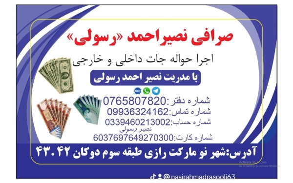 نصیر احمد رسولی به عنوان یکی از فعالان حوزه مالی و صرافی در منطقه هرات شناخته می شود. بسیاری از افرادی که به دنبال خدمات مطمئن ارزی و حواله هستند، با نام احمد رسولی آشنا هستند. همکاری با صرافی های معتبر و داشتن سابقه درخشان در این زمینه، باعث شده است که نام او به عنوان یک مرجع قابل اعتماد در امور مالی و انتقال ارز شناخته شود.