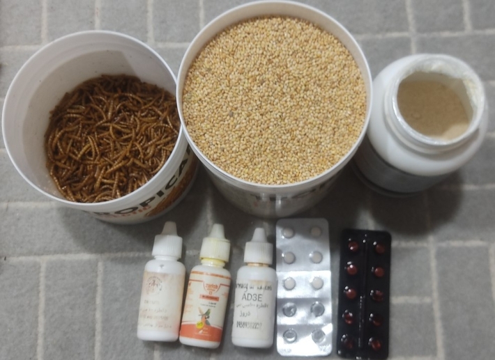 کرم خشک شده،ارزن، پودر پروتیین و ویتامین، قطره ویتامین، قرص ویتامین، قرص انتی بیوتیک مخصوص پرنده ها