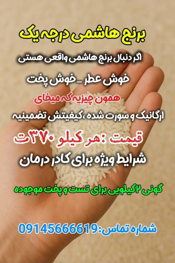 برنج هاشمی درجه یک ارگانیک سورت شده ، گونی ها 10 کیلویی هست ،. دوستان هر کسی خواست هماهنگ بشیم .گونی های 2 کیلویی برای تست پخت و کیفیت موجود هست . برنج محلی و صد در صد بدون کود و سموم هست . ارسال تبریز رایگان سایر شهر ها هزینه ارسال بر عهده مشتری .