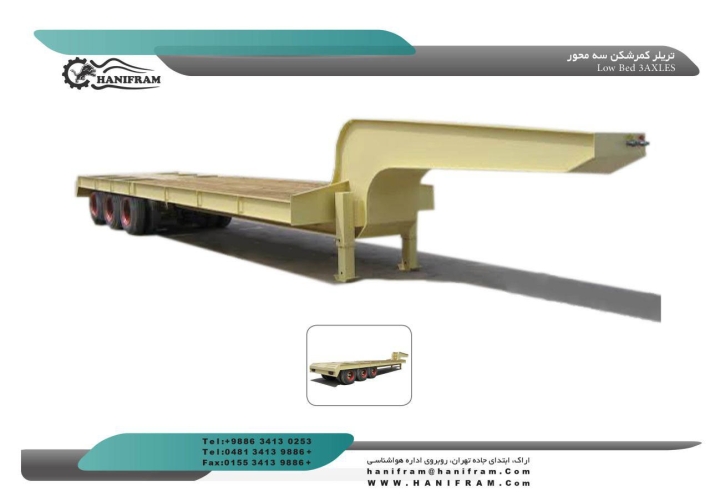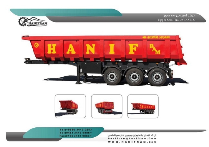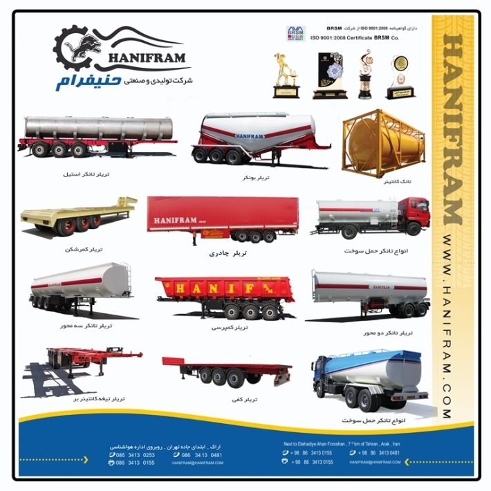 شرکت تولیدی و صنعتی حنیفرام تولید کننده انواع تریلر شامل تانکر 4 مواد.بونکر.کمپرسی.کفی.تیغه و کمر شکن با بیش از 40 سال سابقه و تولید محصولات مطابق با استانداردهای جهانی آماده ارایه خدمات به شما گرامیان میباشد.تمامی محصولات شرکت دارای تاییدیه سازمان ملی استاندارد همراه با سند و پلاک میباشد.