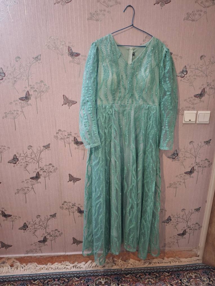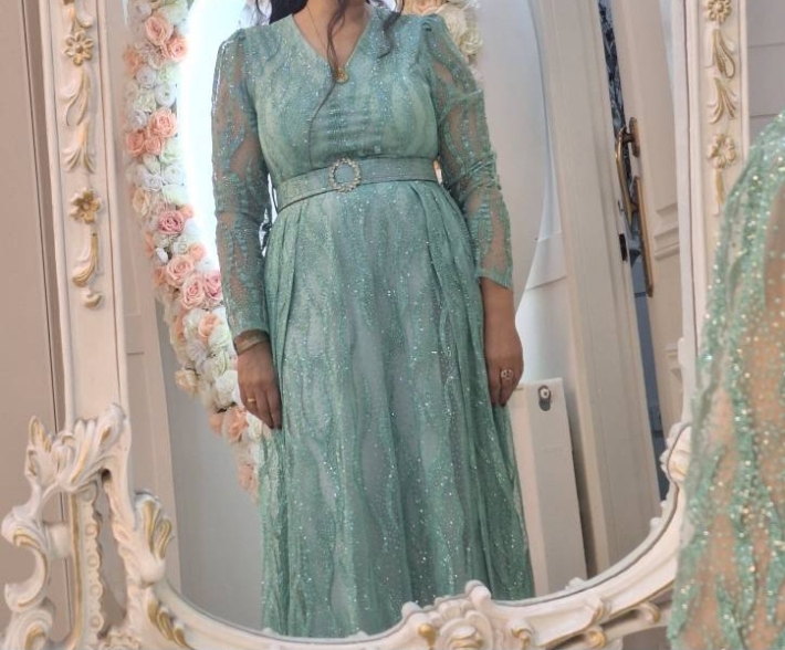 لباس مجلسی پوشیده بلند سبزآبی تنخور قشنگ تا سایز 44 میخوره شاین درخشان کارشده