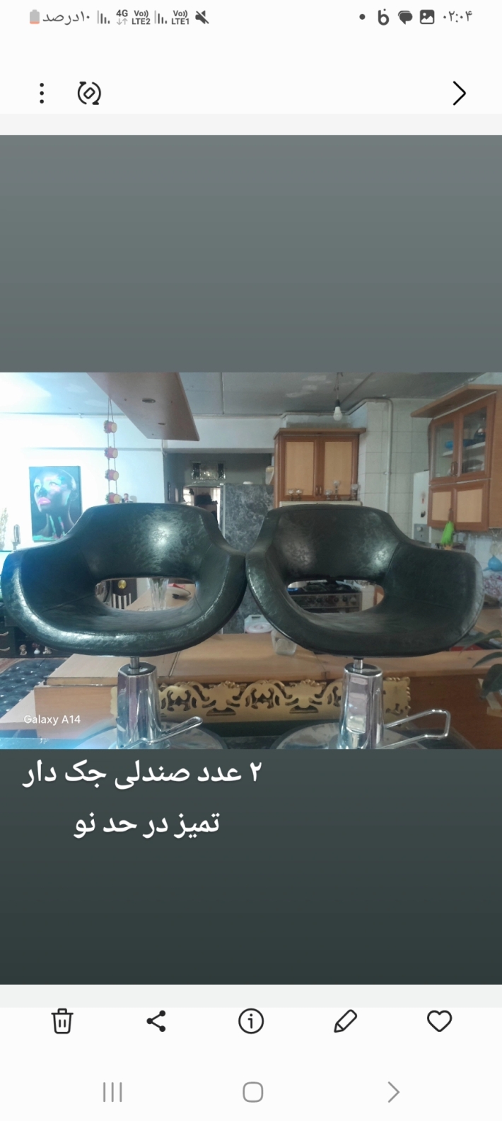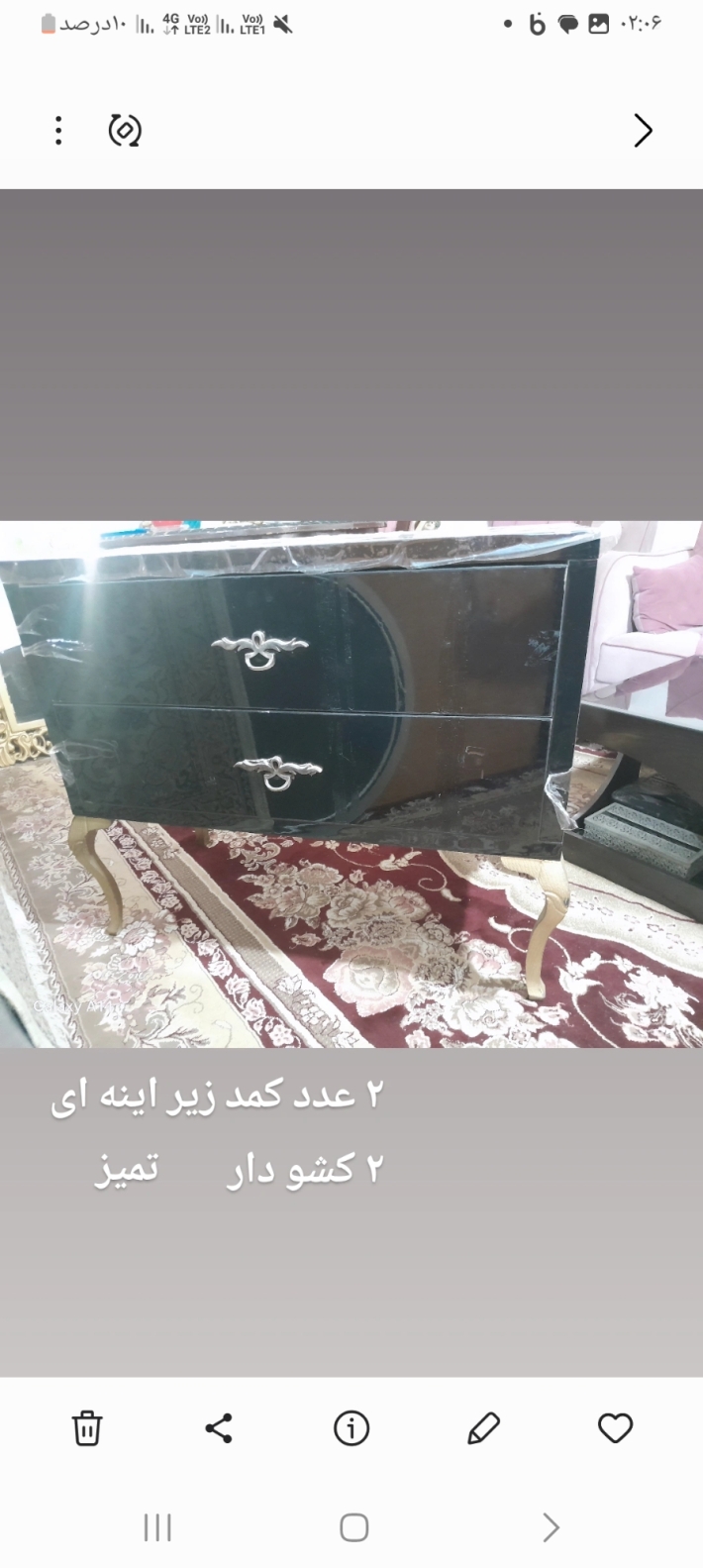 2 عدد صندلی جکدار 2عدد اینه قدی الیدی دار 2 عدد کمد دو کشودار 2 عدد اینه ست کمد 1 عدد باف صندوق دار 1 عدد وکس