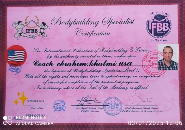 دارنده بالاترین مدرک مربی گری بدنسازی از IFBB آمریکا