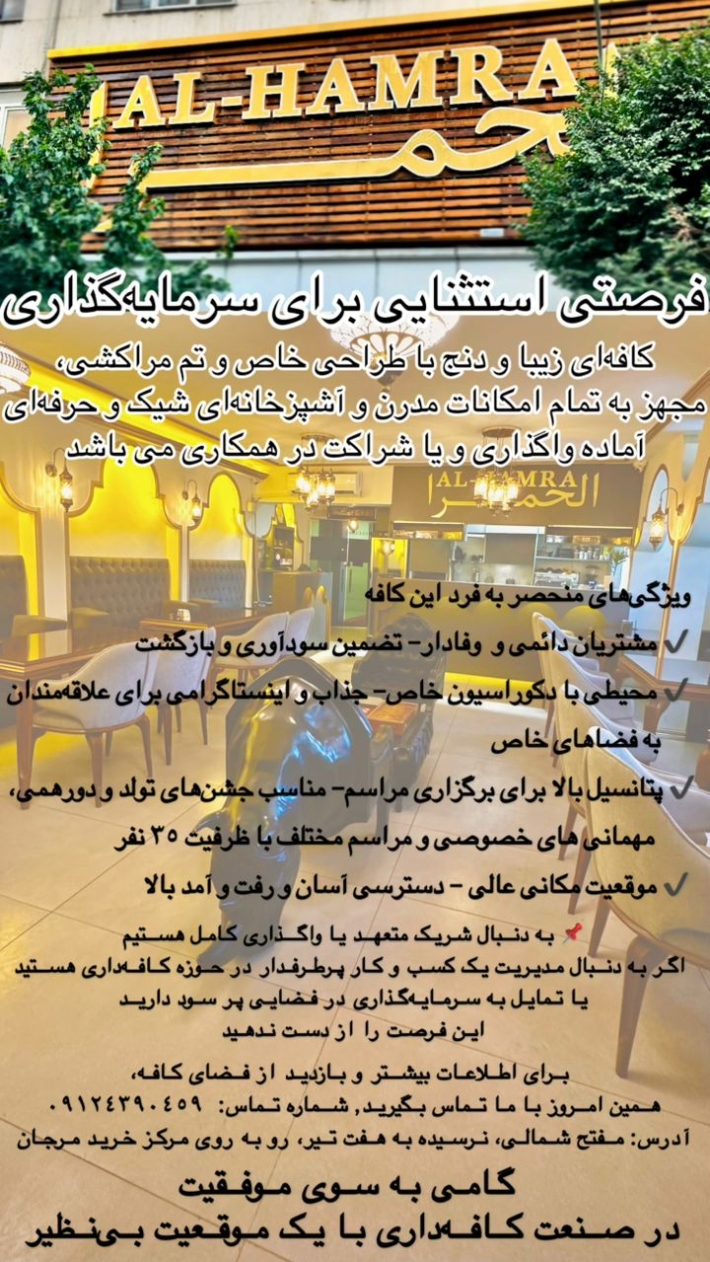 ✨فرصتی استثنایی برای سرمایهگذاری✨ کافهای زیبا و دنج با طراحی خاص و تم مراکشی، مجهز به تمام امکانات مدرن و آشپزخانهای شیک و حرفهای آماده واگذاری ویا شراکت در همکاری می باشد ویژگیهای منحصر به فرد این کافه: ✔ مشتریان دائمی و وفادار– تضمین سودآوری و بازگشت سرمایه ✔ محیطی با دکوراسیون خاص– جذاب و اینستاگرامی برای علاقهمندان به فضاهای خاص ✔ پتانسیل بالا برای برگزاری مراسم– مناسب جشنهای تولد و دورهمی، مهمانی های خصوصی و مراسم مختلف با ظرفیت 35 نفر ✔ موقعیت مکانی عالی – دسترسی آسان و رفت و آمد بالا به دنبال شریک متعهد یا واگذاری کامل هستیم اگر به دنبال مدیریت یک کسبوکار پرطرفدار در حوزه کافهداری هستید یا تمایل به سرمایهگذاری در فضایی پرسود دارید، این فرصت را از دست ندهید! برای اطلاعات بیشتر و بازدید از فضای کافه، همین امروز با ما تماس بگیرید: ***************** **گامی به سوی موفقیت در صنعت کافهداری با یک موقعیت بینظیر