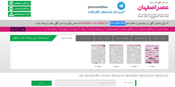 سایت عصر اصفهان از سال 1390 فعالیت خود را با مدیریت مهندس میلاد ریسیان آغاز نموده است بازار هدف این نیازمندی در مرحله نخست شهر اصفهان و سپس پوشش کل استان اصفهان و در نهایت کل کشور میباشد ، که در حال حاضر توانسته ایم در 6 امین سال فعالیت خود به عنوان برترین نیازمندی اینترنتی استان اصفهان با تعداد بازدیدکنندگا ن بالا قرار بگیریم درج اگهی در سایت بدون پرداخت هزینه نیز مقدور میباشد اما شما برای نمایش بیشتر آگهی خود، میتوانید با پرداخت هزینه آنها را ویژه نمایید.