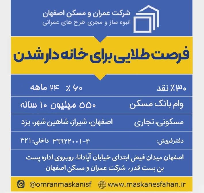 شرکت عمران ومسکن اصفهان در نظر دارد املاک خود واقع در شاهین شهر، یزد و شیراز را از طریق مزایده عمومی شماره 1404/02 به فروش برساند. متقاضیان میتوانند جهت کسب اطلاعات بیشتر از تاریخ شنبه 1404/09/08 در وب سایت شرکت قسمت مزایده ها اسناد را دانلود و یا بصورت حضوری (شنبه تا چهارشنبه) جهت دریافت اسناد به آدرس اصفهان- میدان فیض- خیابان آپادانا اول (شهید قدوسی)- بن بست قدر – شرکت عمران و مسکن اصفهان واحد دبیرخانه مراجعه نمایید. آخرین مهلت دریافت اسناد مزایده و تحویل پاکات تا پایان وقت اداری روز سه شنبه 1404/09/18 میباشد. شرکت در قبول و یا رد یک یا کلیه پیشنهادات مختار خواهد بود. ضمناً سپرده شرکت در مزایده برای هر ردیف معادل 5 درصد قیمت پایه کل ملک میباشد.